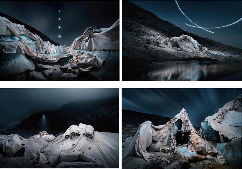 英国皇家地理学会“气候变化奖”授予摄影师利亚姆·曼(Liam Man),他的作品《冰原巨兽的尸体》(Carcass of the Ice Beast)关注了瑞士罗纳冰川的消融现象。2009年,为了延缓冰川的融化,人们在冰川表面覆盖了热反射毯。然而,如今这些覆盖物已变得残破不堪,悬挂在冰川表面,宛如一头垂死巨兽撕裂的皮肤。