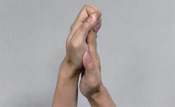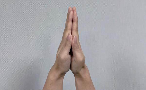 双手手掌相对合起,右手指尖从左手手掌下端搓至中指第二关节处;左手手指向下弯曲,自然包裹住右手指尖,并且微微用力捏一下;换左手做相同动作。左右手来回搓掌为1回合,搓36回合。