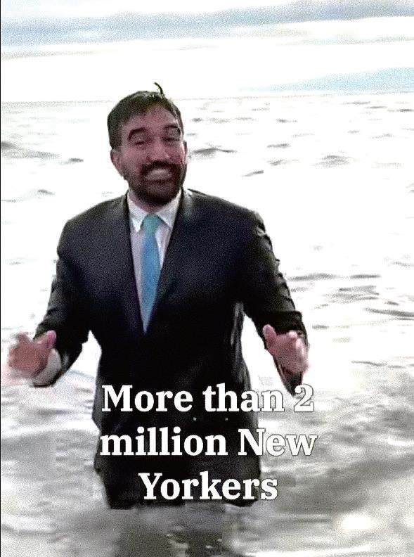 穿着一身西装的马姆达尼,一头扎进海水。他全身上下被海水泡湿,但依然对着镜头露出笑容,诉说自己的政纲。拿着麦克风,他试图用冰冻的海水“freezing”,来比喻上任后要让纽约高昂的房租“冻结”(rent freezing)。