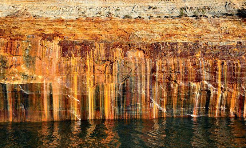 北美五大湖中的苏必利尔湖是世界上面积最大的淡水湖,也是美国和加拿大的界湖。苏必利尔湖的东南岸位于美国密歇根州境内,在缪尼辛和大马雷两座小城间,湖岸线长约67千米。这段湖岸不但包含细软平缓的沙滩,还有如沙漠般高耸的沙丘,更有高出湖面60余米的砂岩峭壁。连绵的岩壁如同从绿松石色的湖水中直接升起,蔚为壮观,岩壁上还能看见洞穴、拱桥等奇景。多种矿物质为岩壁染上了翠绿、明黄、淡紫、褐红等鲜艳色彩,宛如画家留下的丹青妙笔,故而得名“图画岩”。