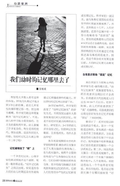 我们大都记不起2∼3岁以前的事,此后几年发生的事即便记得一些,但也相当模糊。科学家们将这种现象称为“幼年记忆缺失”。可是,幼儿的学习能力是很强的,在人生的最初两年里,幼儿掌握了许多复杂的、终生受用的技巧,例如走路、说话和识别人的脸,但幼时的记忆后来怎么就被忘得一干二净了呢?科学家们研究发现,2∼3岁的幼儿并非没有记忆,而是那种记忆很微弱,且容易消失。为什么会这样呢?早期的研究一直认为这仅仅是因为人们在幼儿时期没有形成构建记忆和描述事件的能力。但是近年研究有了新突破。