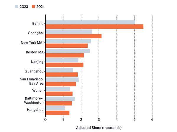 指数显示,2024年,中国城市在自然科学领域前10名中占据6席,与2023年持平。依据自然指数的核心衡量指标“调整后份额”(Adjusted Share),北京再次位居全球榜首。上海、南京、广州、武汉和杭州则分别位于第二、第五、第六、第八和第十位。这一数据分布反映了高质量基础研究产出在全球范围内的重新配置。
