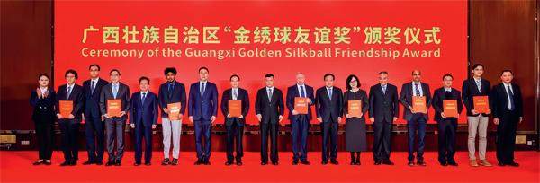 11月19日,2025年度广西壮族自治区“金绣球友谊奖”颁奖仪式在南宁举行,10位来桂工作的外国专家获颁寓意美好的广西“金绣球”。