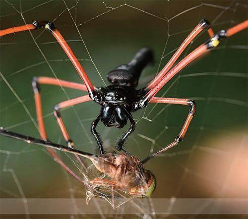这种蜘蛛平时会守着蛛网等猎物,抓到飞蛾等昆虫会立刻吃掉;但碰到萤火虫时,会先将其“囚禁”在蛛网上。