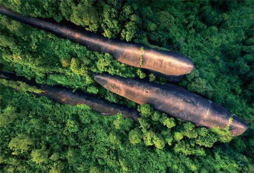 “三鲸岩”是泰国一处天然岩石,远远望去,就像鲸鱼一家三口并肩游弋。三块被岁月拉得颀长、磨得浑圆的巨石,活脱脱像是漂浮在林海里的大鲸鱼。