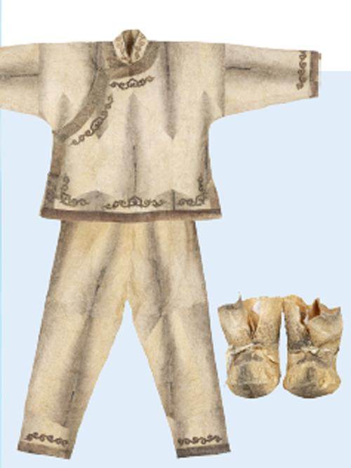 赫哲族生活在东北三江流域,当地气候寒冷、冬季漫长,但鱼类资源充足;且其世居地之一的大顶子山具有丰厚的山产资源,是狩猎的最佳场所,由此发展出以渔猎为主的生产方式。赫哲族的传统服饰有鱼皮衣服、鱼皮套裤、鱼皮靴子等。2006年,赫哲族鱼皮制作技艺入选第一批国家级非物质文化遗产代表性项目名录。赫哲族鱼皮服饰制作方法为:选取长度为50厘米以上的大马哈鱼或鲑鱼,完整剥取其表皮,阴干后涂抹玉米面去除油脂腥味,用木铡刀反复铡压上千次,使鱼皮柔软如棉布;缝制时,用鱼肝油保持鱼皮线的柔韧度,并将鱼皮染色,裁剪成云纹、浪花纹等图案,装饰在衣襟和袖口之处。其中,鱼皮套裤只有裤管,没有裤裆,裤管用长系带绑在大腿根部或固定在腰上,起到保暖和防止打猎时树枝刮坏腿部的作用。鱼皮靴子又叫靰鞡,一张大鱼皮可做一双靰鞡鞋,冬季时靴子里边要套上狍皮袜子或垫上乌拉草。
