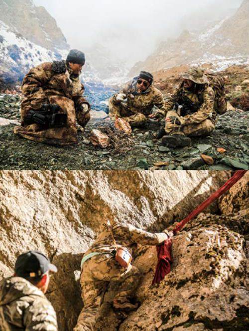 我们在无人区的生活简单而规律。我和小胡分工明确:清晨四点多小胡先去前哨值守,七点左右我起床后,在营地做好早饭送去。之后我沿沟巡查,中午返回营地做饭。小胡回来一起吃过午饭后,他便休息,我就去前哨,下午六点左右小胡来跟我换岗,继续坚守到夜间九点。最初,在我们周围没有任何野生动物现身,直到一周后,几十只藏雪鸡被帐篷周边的饭渣吸引而来,再后来两群岩羊也出现在附近。岩羊是雪豹的主要猎物,它们的出现让我们坚信雪豹就在周边,只是雪豹生性警惕,还在熟悉我们的气味。